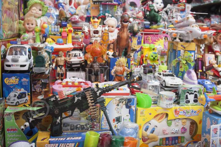 MEXICO, D.F., 03ENERO2013.- Don José tiene 38 años como locatario en el Mercado de "La Bola" en el Pedergal de Santo Domingo y en todo ese tiempo ha vendido juguetes, comenzando por los llamados tradicionales, caballos de madera, aviones de latón, los cuales ha tenido que cambiar por los de "Moda" que en su mayoria son de plástico y provenientes de China entre los cuales destacan, trompos de plástico, ametralladoras, carritos y aviones. para Don José la venta ha decaido y gracias a que la renta del local es baja puede subsistir. FOTO: FRANCISCO RODRÍGUEZ / CUARTOSCURO.COM