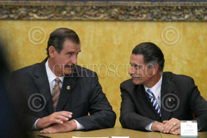 MEXICO, D.F. 22FEBRERO2006.- El presidente Vicente Fox conversa con Carlos Abascal, secretario de Gobernación durante la presentación del fiscal para la atención de delitos cometidos contra periodistas. FOTO: Nelly Salas/CUARTOSCURO.COM