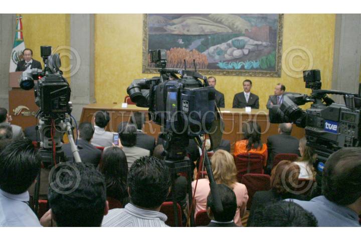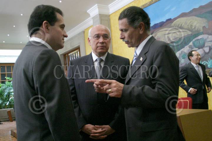 MEXICO, D.F. 22FEBRERO2006.- Daniel Cabeza de Vaca, procurador de general del la República, Rubén Aguilar, vocero de la presidencia de la República y Carlos Abascal, secretario de Gobernación, conversan previo a la presentación del fiscal para la atención de delitos cometidos contra periodistas. FOTO: Nelly Salas/CUARTOSCURO.COM