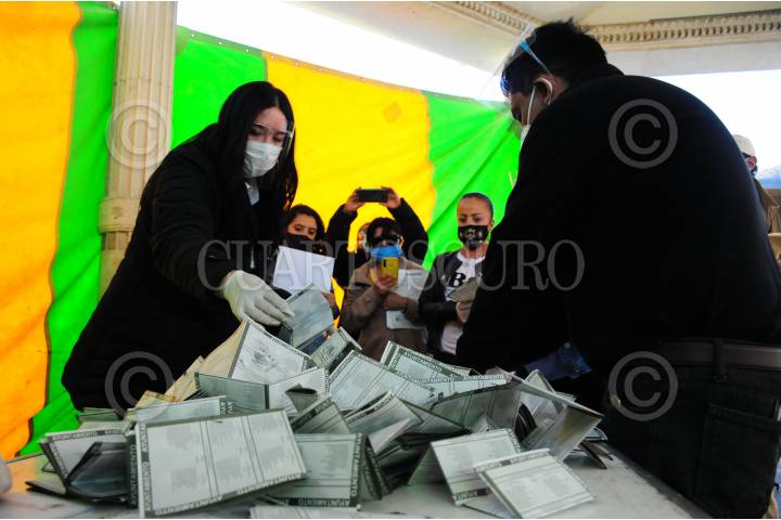 Funcionarios de casilla vacían la urna de boletas para contarlas.