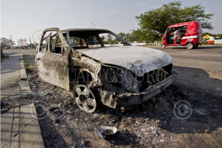 JUCHITÁN, OAXACA, 09JUNIO2015.- Ayer por la tarde, después de una intervención militar y por parte de elementos de la policía estatal, el clima de protesta continúa. En la pasada Jornada Electoral, profesores de la sección 22 de la CNTE incendiaron urnas y paquetes electorales como muestra de su inconformidad ante la situación actual que circunda al país. En la imagen, un vehículo incendiado ayer durante las protestas de ayer en la zona. FOTO: FREYNA LUCERO /CUARTOSCURO.COM