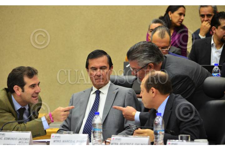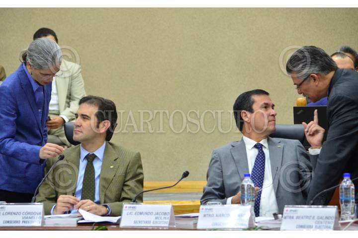 MÉXICO, D.F., 14JUNIO2015.- La consejera Pamela San Martín, el consejero presidente Lorenzo Córdova, el secretario ejecutivo, Edmundo Jacobo, y el consejero Arturo Sánchez, durante la Sesión. El consejero presidente Lorenzo Córdova encabezó la Sesión Extraordinaria en donde se discutieron los pormenores del conteo final de votos de la Morada Electoral 2015. En la sesión se precisó que trescientos consejos distritales llevaron a cabo “exitosamente”, como lo dijo el consejero presidente, la Jornada Electoral 2015, “ocurrió en tiempos previstos en donde 39.7 millones de votantes acudieron a las urnas el pasado 07 de junio”. Mencionó además que por tercera ocasión consecutiva disminuyó el voto nulo dando como resultado un total de 4.7 por ciento de los votantes. FOTO: MARÍA JOSÉ MARTÍNEZ /CUARTOSCURO.COM