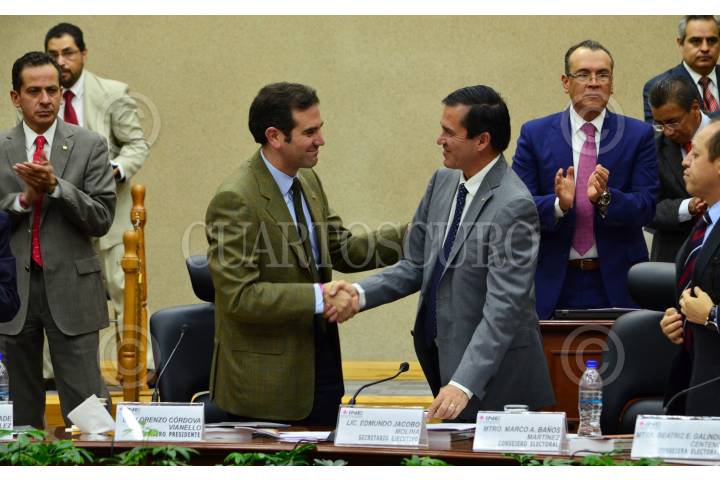 MÉXICO, D.F., 14JUNIO2015.- El consejero presidente Lorenzo Córdova abraza al consejero Marco Antonio Baños, quien lleva en la mano una de las copias del informe que incluye el conteo de los votos que fue entregado por el secretario ejecutivo Edmundo Jacobo. presentó el informe que da cuenta de los votos correspondientes para cada partido. FOTO: MARÍA JOSÉ MARTÍNEZ /CUARTOSCURO.COM