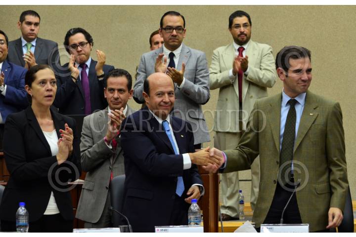 MÉXICO, D.F., 14JUNIO2015.- La consejera Adriana Favela, el consejero Enrique Andrade y el consejero presidente Lorenzo Córdova, durante el festejo por la entrega del informe que da cuenta de los votos correspondientes para cada partido. Al término de la sesión, los consejeros recibieron una copia del informe que incluye los cálculos aproximados del número de votos repartidos entre los contendientes, sin embargo el Tribunal Electoral deberá revisar la información contenida para declarar el proceso de votación cerrado. En este Proceso Electoral 2015, detallaron, la participación ciudadana fue de 47 por ciento. FOTO: MARÍA JOSÉ MARTÍNEZ /CUARTOSCURO.COM