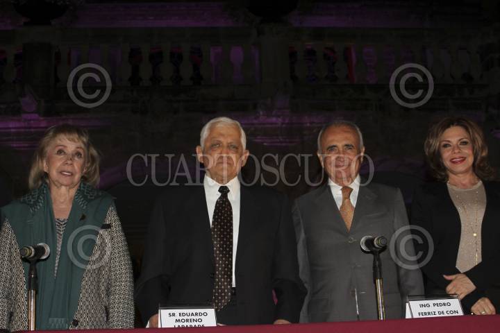 CIUDAD DE MÉXICO, 27MARZO2017.- Maty Buitrón, Eduardo Moreno Laparade, Pedro Ferriz de Con y María Sorté en la Presentación del libro “Un Modelo a la Medida” para conmemorar el 106 aniversario del natalicio de Mario Moreno Reyes (Cantinflas), en la explanada del Castillo de Chapultepec. FOTO: ANTONIO CRUZ /CUARTOSCURO.COM