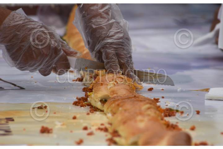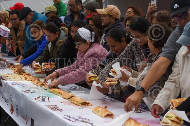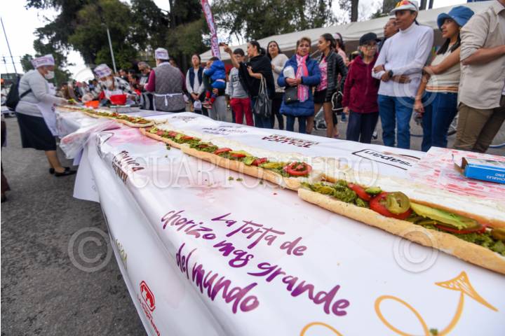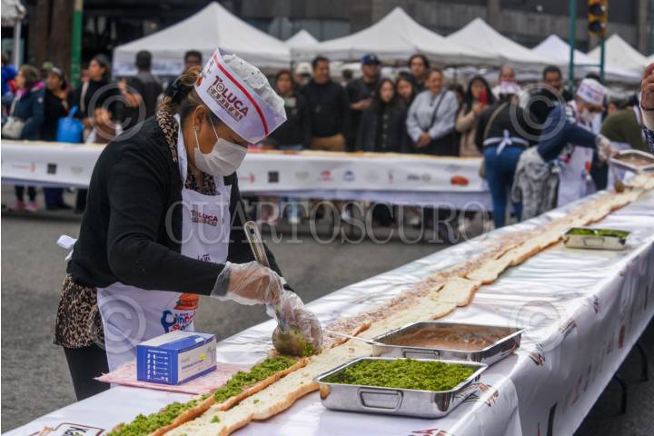 TOLUCA, ESTADO DE MÉXICO, 15JUNIO2025.- En Toluca se preparó la torta más grande de chorizo del mundo, con una longitud de 82 metros, elaborada con 100 kilos de chorizo rojo y verde, el cual fue elaborado por 10 maestras y maestros artesanos, también fueron utilizados 20 kilos de frijoles, 42 de aguacate, 46 de jitomate, 20 de chiles, 60 litros de crema y 82 metros de pan artesanal. Un notario público dio fe del tamaño de esta torta, superando el récord anterior que era de 75 metros establecido en la alcaldía Venustiano Carranza de la CDMX. En la elaboración de la torta más grande de chorizo del mundo participaron 60 personas que se dieron cita en el monumento al Centenario de la Independencia, al término de la preparación la torta fue repartida a la gente que asistió al lugar. FOTO: CRISANTA ESPINOSA AGUILAR /CUARTOSCURO.COM