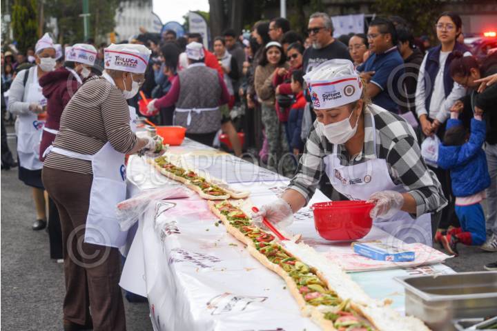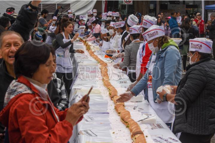 TOLUCA, ESTADO DE MÉXICO, 15JUNIO2025.- Al menos 60 personas participaron en la preparación de la torta más grande de chorizo del mundo, con una longitud de 82 metros, elaborada con 100 kilos de chorizo rojo y verde, el cual fue elaborado por 10 maestras y maestros artesanos, también fueron utilizados 20 kilos de frijoles, 42 de aguacate, 46 de jitomate, 20 de chiles, 60 litros de crema y 82 metros de pan artesanal. Un notario público dio fe del tamaño de esta torta, superando el récord anterior que era de 75 metros establecido en la alcaldía Venustiano Carranza de la CDMX. FOTO: CRISANTA ESPINOSA AGUILAR /CUARTOSCURO.COM