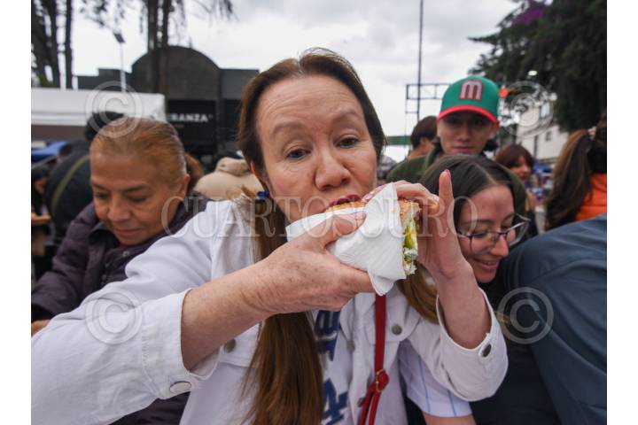 TOLUCA, ESTADO DE MÉXICO, 15JUNIO2025.- Asistentes a la preparación de la torta más grande de chorizo del mundo en Toluca, con una longitud de 82 metros, pudieron disfrutar al término del evento de este alimento; elaborada con 100 kilos de chorizo rojo y verde, el cual fue elaborado por 10 maestras y maestros artesanos, también fueron utilizados 20 kilos de frijoles, 42 de aguacate, 46 de jitomate, 20 de chiles, 60 litros de crema y 82 metros de pan artesanal. Un notario público dio fe del tamaño de esta torta, superando el récord anterior que era de 75 metros establecido en la alcaldía Venustiano Carranza de la CDMX. En la elaboración de la torta más grande de chorizo del mundo participaron 60 personas que se dieron cita en el monumento al Centenario de la Independencia, al término de la preparación la torta fue repartida a la gente que asistió al lugar. FOTO: CRISANTA ESPINOSA AGUILAR /CUARTOSCURO.COM