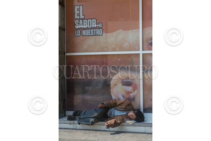 MÉXICO, D.F., 25MAYO2015.- Un indigente duerme afuera de un local de comida rápida en el Centro Histórico de la ciudad. FOTO: ISAAC ESQUIVEL /CUARTOSCURO.COM
