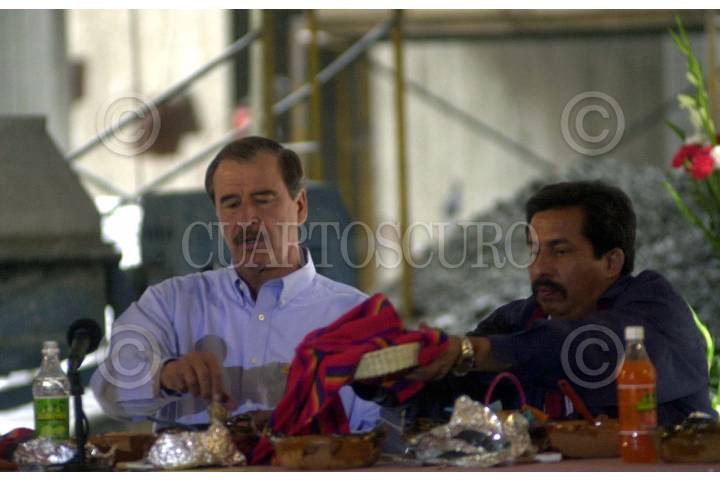 MEXDF03MAYO2004.- El presidente Vicente Fox festyejo el dia de la Santa Cruz, en compañia de trabajadores de la construcción. Entre tortillas y platos de barro el mandatario se sivio varios tacos de arroz,frijoles, tinga, chicharrón y nopales. FOTO: Eunice Adorno/CUARTOSCURO.COM