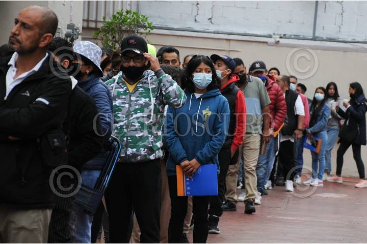 Los padres de familia acompañan en la fila a sus hijos.