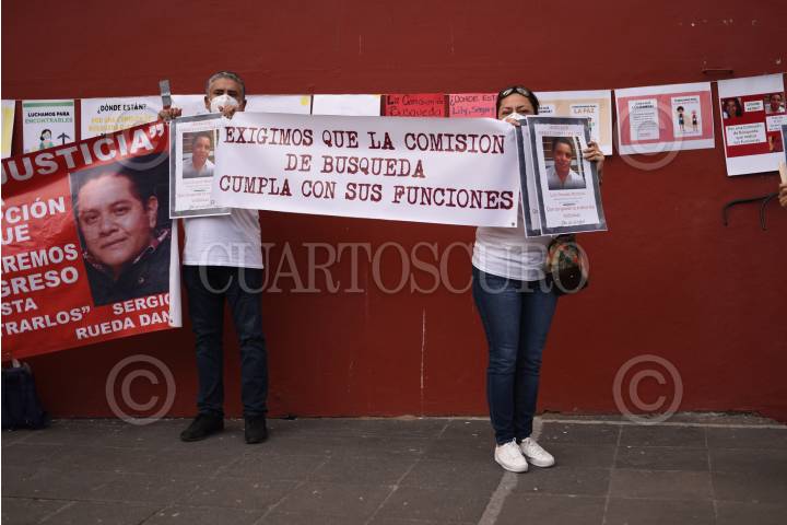 Familiares de Liliana y Sergio Rueda desaparecidos desde 2019 en Córdoba, se manifestaron en la plaza Lerdo de esta ciudad para señalar que la Comisión de Búsqueda no ha dado resultado en estos últimos años.