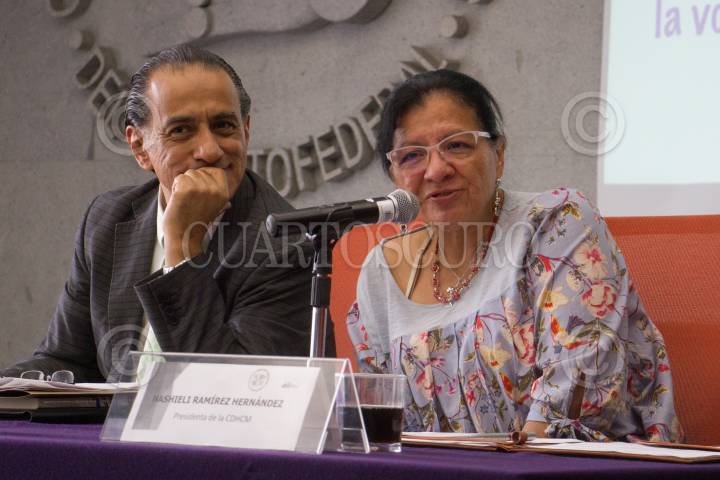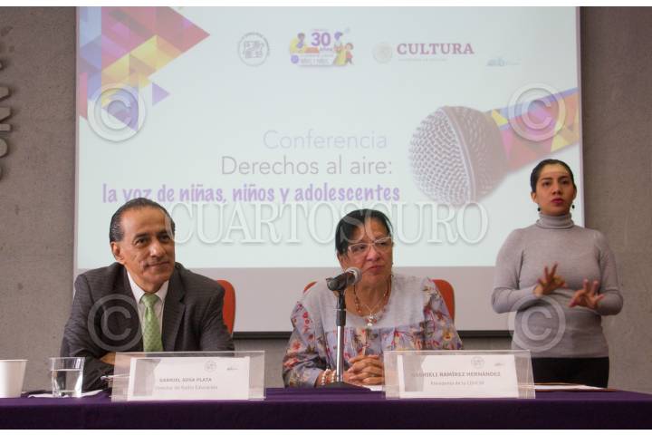 CIUDAD DE MÉXICO, 03OCTUBRE2019.- Gabriel Sosa, director de Radio Educación y Nasheli Hernández, presidenta de la Comisión de Derechos Humanos de la Ciudad, durante la conferencia de prensa donde se dio a conocer los detalles de la convocatoria "Derechos al Aire: la voz de niñas niños y adolescentes", en la sede de la comisión. Cabe mencionar que los ganadores de dicho concurso tendrán la oportunidad de estar al aire atreves de Radio Educación. FOTO: ROGELIO MORALES /CUARTOSCURO.COM