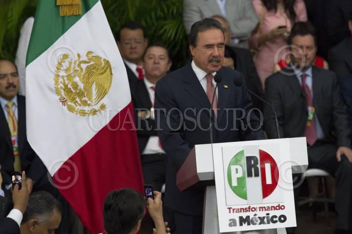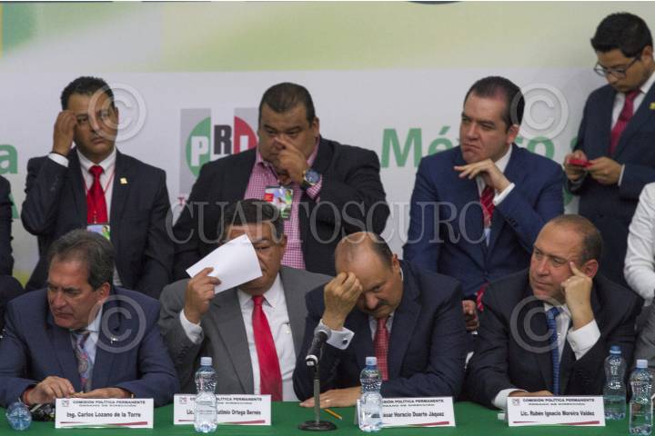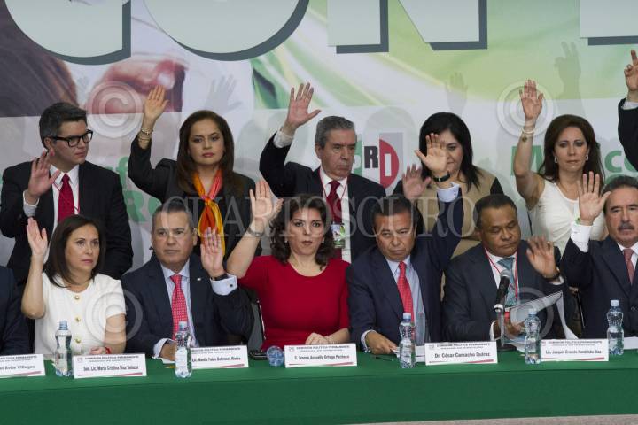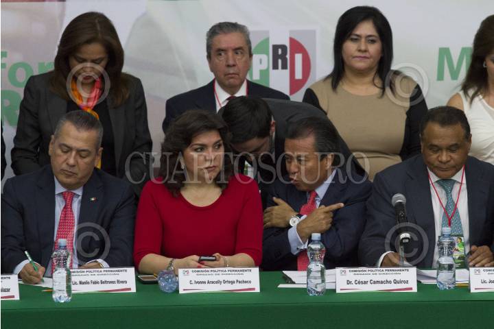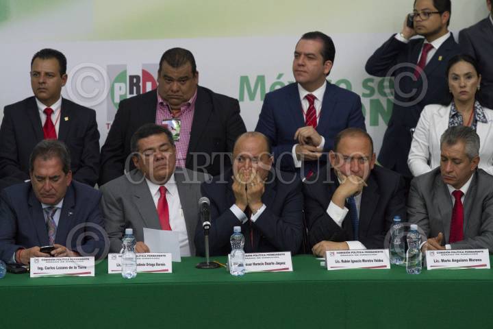 CIUDAD DE MÉXICO, 29NOVIEMBRE2017.- Enrique Ochoa Reza, dirigente nacional del Partido Revolucionario Institucional (PRI); Beatriz Paredes, militante del partido, y Manlio Fabio Beltrones, ex presidente del partido, durante la reunión de la Mesa Política Permanente para dar a conocer la aprobación de documentos y postulación de José Antonio Meade Kuribreña para ser electo candidato a la presidencia en 2018 por el tricolor. FOTO: GALO CAÑAS /CUARTOSCURO.COM