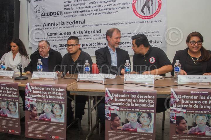 CIUDAD DE MÉXICO, 21AGOSTO2018.- Los hermanos Alejandro y Francisco Cerezo, así como Jan Jarab, representante en nuestro país de la ONU-Derechos Humanos, durante la presentación del 7º Informe “Defender los Derechos Humanos en México: El Sexenio de la Impunidad Junio de 2017 a mayo de 2018”. FOTO: ISAAC ESQUIVEL /CUARTOSCURO. COM