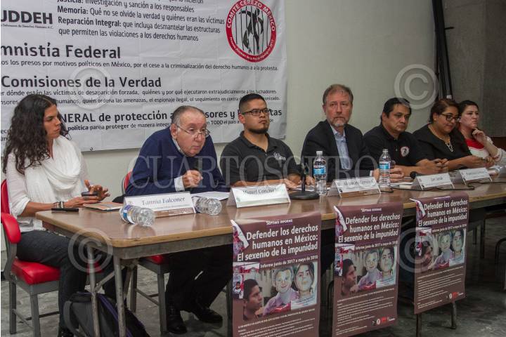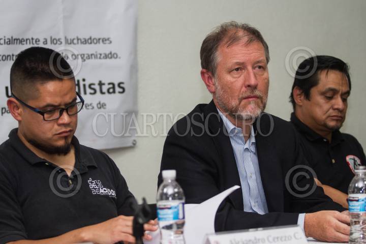 CIUDAD DE MÉXICO, 30AGOSTO2017.- Héctor Cerezo, miembro del Comité Cerezo México; e integrantes de la Campana Nacional contra la desaparición forzadas, leyeron un comunicado de prensa para exigir a la Cámara de Diputados hacer las modificaciones necesarias a la Ley General contra la desaparición forzada y desaparición cometida por particulares. FOTO: MARIO JASSO /CUARTOSCURO.COM