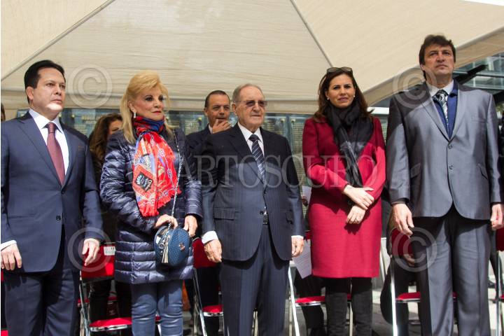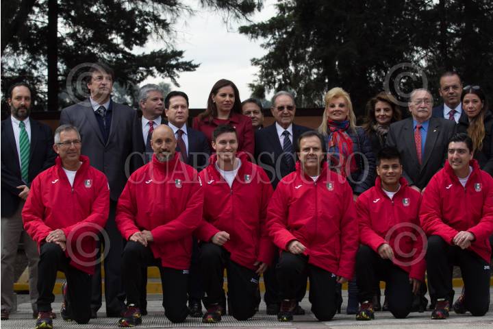 CIUDAD DE MÉXICO, 31ENERO2018.- Daniel Aceves Villagran, presidente de la Asociación de Medallistas Olímpicos Mexicanos; María de los Ángeles Aldir de Vázquez, esposa de Olegario Vázquez Raña; Olegario Vázquez Raña, miembro del Comité Olímpico Internacional; Jimena Saldaña de Aja, vicepresidenta del Comité Olímpico Mexicano, y Mario García de la Torre, secretario general del Comité Olímpico Mexicano (COM), durante la ceremonia de abanderamiento de la delegación de deportistas que asistirá a los Juegos Olímpicos de Invierno, próximos a iniciar el nueve de febrero en Pyeongchang, Corea del Sur. La delegación mexicana contará con la participación de Sarah Schleper y Rodolfo Dickson (esquí alpino), Robby Franco (esquí estilo libre), y Germán Madrazo (esquí de fondo). FOTO: GALO CAÑAS /CUARTOSCURO.COM