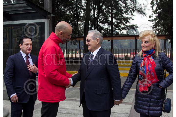 CIUDAD DE MÉXICO, 31ENERO2018.- Daniel Aceves Villagran, presidente de la Asociación de Medallistas Olímpicos Mexicanos; Germán Madrazo (esquí de fondo), atleta olímpico, Olegario Vázquez Raña, miembro del Comité Olímpico Internacional, y María de los Ángeles Aldir de Vázquez, esposa de Olegario Vázquez Raña, durante la ceremonia de abanderamiento de la delegación de deportistas que asistirá a los Juegos Olímpicos de Invierno, próximos a iniciar el nueve de febrero en Pyeongchang, Corea del Sur. La delegación mexicana contará con la participación de Sarah Schleper y Rodolfo Dickson (esquí alpino), Robby Franco (esquí estilo libre). FOTO: GALO CAÑAS /CUARTOSCURO.COM
