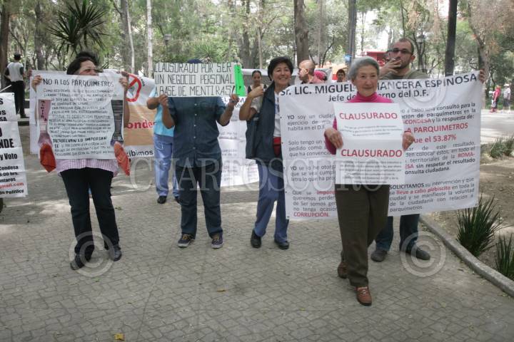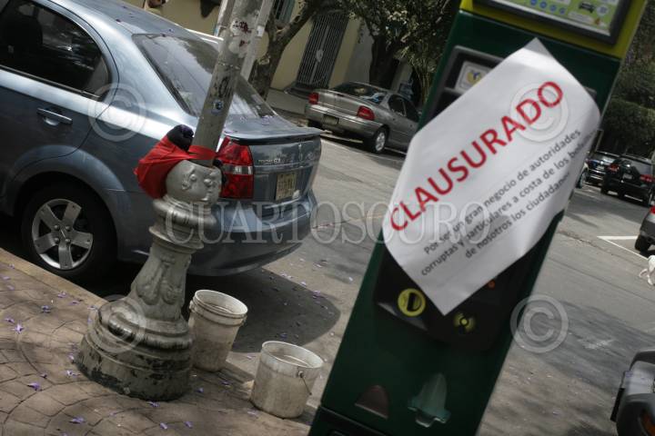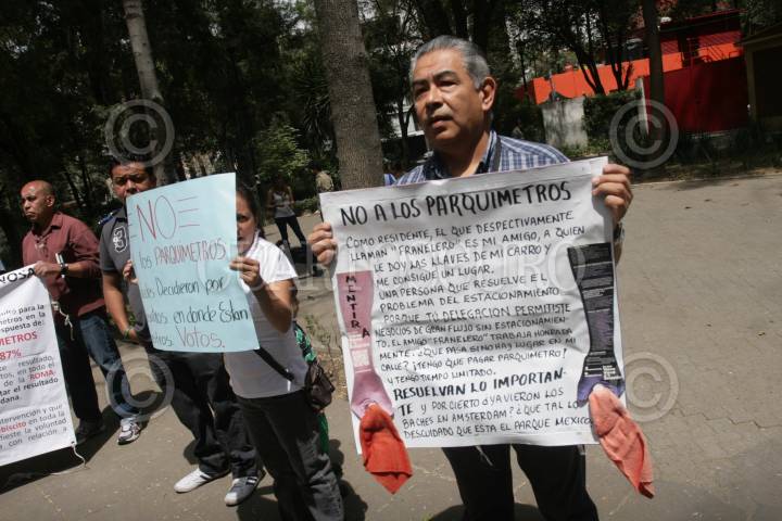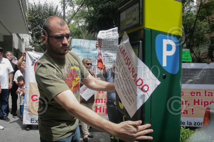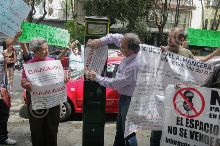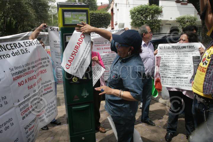 MÉXICO, D.F. 10MARZO2013.- Vecinos de las Colonias Roma y Condesa clausuraron simbólicamente los parquímetros instalados para comenzar a funcionar mañana, llamaron a que se retiren pues aseguran ellos ganaron con el "no" en la pasada consulta realizada por la delegación Cuauhtémoc. FOTO: JUAN PABLO ZAMORA /CUARTOSCURO.COM