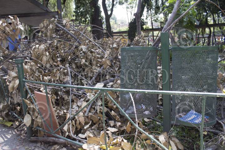 MEXICO, D.F, 23AGOSTO2014.-El Comité Vecinal de Tlatelolco ofreció un recorrido a través de los corredores del conjunto habitacional Nonoalco, en conmemoración del 50 aniversario de su fundación. Aunque los vecinos se esfuerzan por mantener las instalaciones en condiciones óptimas, señalan que es difìcil conseguir que el gobierno delegacional aporte recursos para obras de remozamiento y mantenimiento, a pesar de que el jefe delegacional, Alejandro Fernández, ha señalado en varias ocasiones que se destinaran fondos para tales obras, los habitantes nunca han recibido nada y el deterioro es visible en todos los edificios y jardines. En la imagen, ramas y follaje de árboles abandonados junto a un bote de basura en uno de los corredores. FOTO: DAVID POLO /CUARTOSCURO.COM