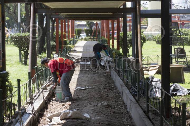 MEXICO, D.F, 23AGOSTO2014.-El Comité Vecinal de Tlatelolco ofreció un recorrido a través de los corredores del conjunto habitacional Nonoalco, en conmemoración del 50 aniversario de su fundación. Aunque los vecinos se esfuerzan por mantener las instalaciones en condiciones óptimas, señalan que es difìcil conseguir que el gobierno delegacional aporte recursos para obras de remozamiento y mantenimiento, a pesar de que el jefe delegacional, Alejandro Fernández, ha señalado en varias ocasiones que se destinaran fondos para tales obras, los habitantes nunca han recibido nada y el deterioro es visible en todos los edificios y jardines. En la imagen, albañiles realizan algunas obras cuyos recurso parten de un fondo participativo de los vecinos. FOTO: DAVID POLO /CUARTOSCURO.COM