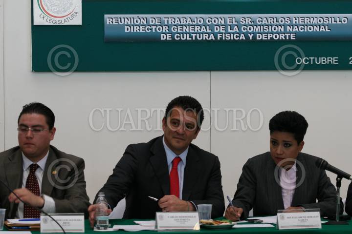 MÉXICO D.F., 21OCTUBRE2008.- Carlos Manuel Hermosillo Goytortua, Director General de la CONADE, acudió esta tarde a la Cámara de Diputados donde compareció ante la Comisión del Nacional de Cultura Física y Deporte de esta cámara. En la imagen es acompañado de los Diputados Elizabeth Morales García presidenta de la comisión y del diputado José Luis Aguilera. FOTO: GUILLERMO PEREA/CUARTOSCURO.COM