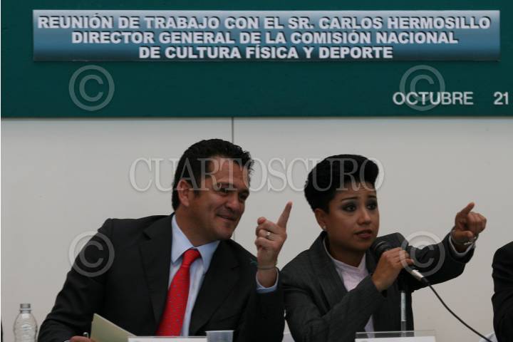 MÉXICO D.F., 21OCTUBRE2008.- Carlos Manuel Hermosillo Goytortua, Director General de la CONADE, acudió esta tarde a la Cámara de Diputados donde compareció ante la Comisión del Nacional de Cultura Física y Deporte de esta cámara. En la imagen es acompañado de los Diputados Elizabeth Morales García presidenta de la comisión. FOTO: GUILLERMO PEREA/CUARTOSCURO.COM