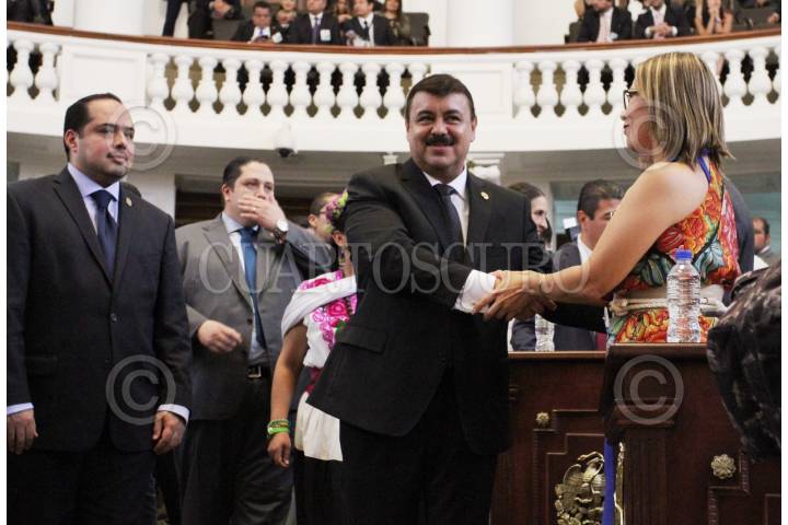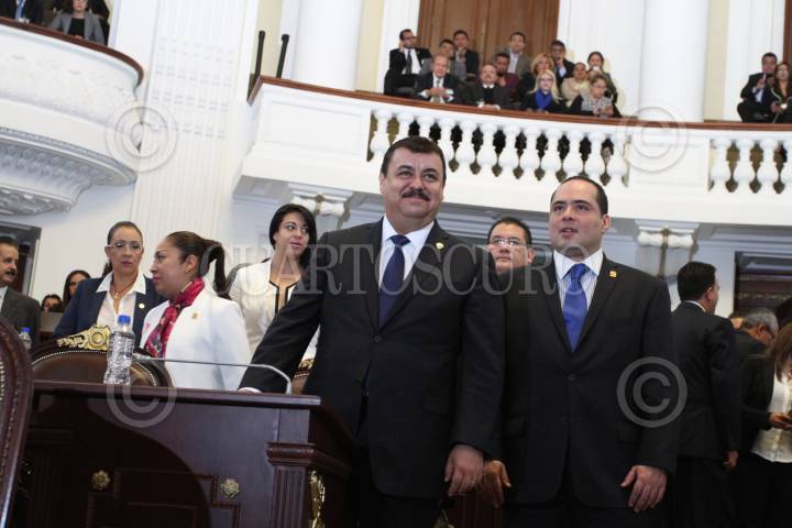 MÉXICO, D.F., 08OCTUBRE2015.- Diputados de Morena alzaron pancartas para protestar durante la comparecencia de Hiram Almeida, secretario de Seguridad Pública. En la imagen, Leonel Luna, coordinador de bancada del PRD y Nora Arias durante la protesta de los diputados de Morena. FOTO: MARÍA JOSÉ MARTÍNEZ /CUARTOSCURO.COM