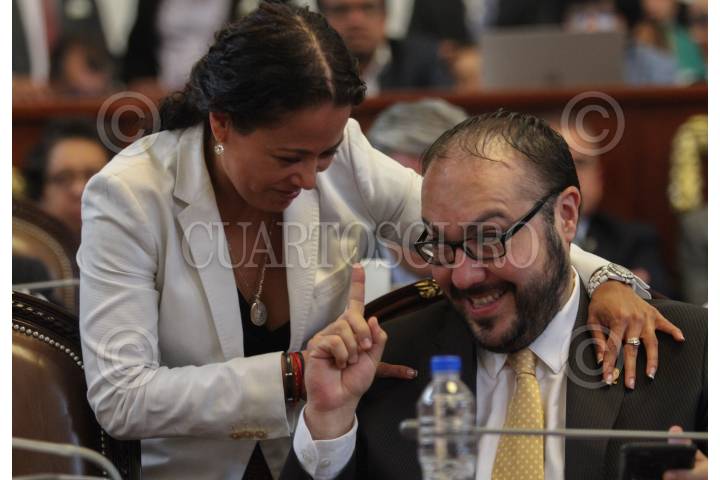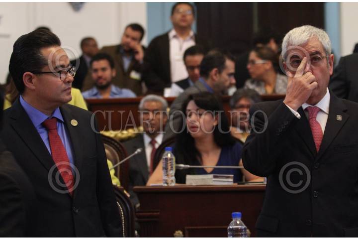 MÉXICO, D.F., 06OCTUBRE2015.- Felipe de Jesús Gutiérrez, titular de la Secretaría de Desarrollo Urbano y Vivienda, compareció ante el pleno de la Asamblea Legislativa del Distrito Federal. A lo largo de 20 minutos presentó su comparecencia ante los asambleístas, mientras se manifestaban, al exterior del recinto, decenas de integrantes de la Asamblea de Barrios y vecinos de la colonia Pencil, quienes exigían el aumento de presupuesto para la colonia. En la imagen, al fondo la secretaria Patricia Mercado y adelante Manuel Ballesteros, ex delegado de Venustiano Carranza. FOTO: MARÍA JOSÉ MARTÍNEZ /CUARTOSCURO.COM