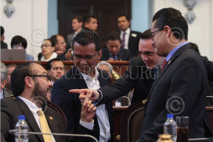MÉXICO, D.F., 06OCTUBRE2015.- Felipe de Jesús Gutiérrez, titular de la Secretaría de Desarrollo Urbano y Vivienda, compareció ante el pleno de la Asamblea Legislativa del Distrito Federal. A lo largo de 20 minutos presentó su comparecencia ante los asambleístas, mientras se manifestaban, al exterior del recinto, decenas de integrantes de la Asamblea de Barrios y vecinos de la colonia Pencil, quienes exigían el aumento de presupuesto para la colonia. En la imagen, Mauricio Toledo, ex delegado de Coyoacán, el diputado del PRI Adrían Ruvalcaba, quien lo apunta con su dedo, y Leonel Luna, coordinador de la ALDF. FOTO: MARÍA JOSÉ MARTÍNEZ /CUARTOSCURO.COM