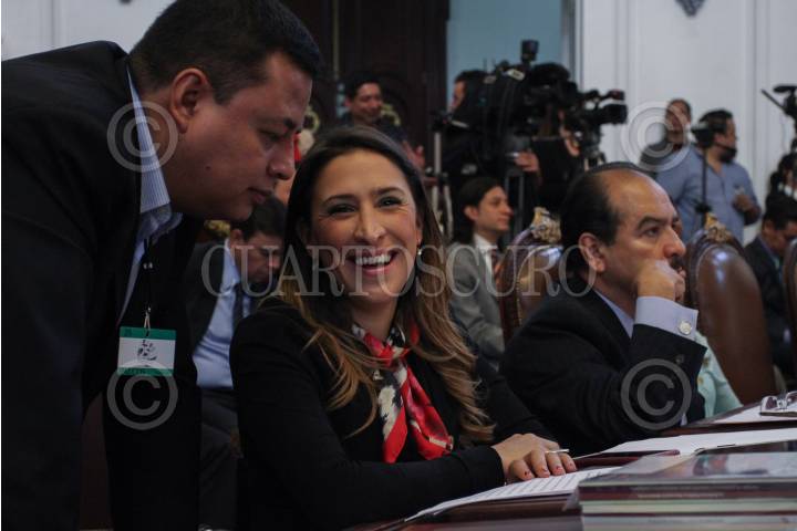 MÉXICO, D.F., 06OCTUBRE2015.- Felipe de Jesús Gutiérrez, titular de la Secretaría de Desarrollo Urbano y Vivienda, compareció ante el pleno de la Asamblea Legislativa del Distrito Federal. A lo largo de 20 minutos presentó su comparecencia ante los asambleístas, mientras se manifestaban, al exterior del recinto, decenas de integrantes de la Asamblea de Barrios y vecinos de la colonia Pencil, quienes exigían el aumento de presupuesto para la colonia. En la imagen, Mariana Moguel, hija de Rosario Robles, durante la comparecencia del titutlar de Seduvi. FOTO: MARÍA JOSÉ MARTÍNEZ /CUARTOSCURO.COM
