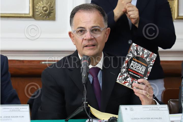 CIUDAD DE MÉXICO, 21NOVIEMBRE2024.- Ulrich Richter Morales, candidato a ocupar el cargo de Fiscal General de la capital, muestra uno de sus libros durante si comparecencia frente al Consejo Judicial Ciudadano. FOTO: DANIEL AUGUSTO/ CUARTOSCURO.COM