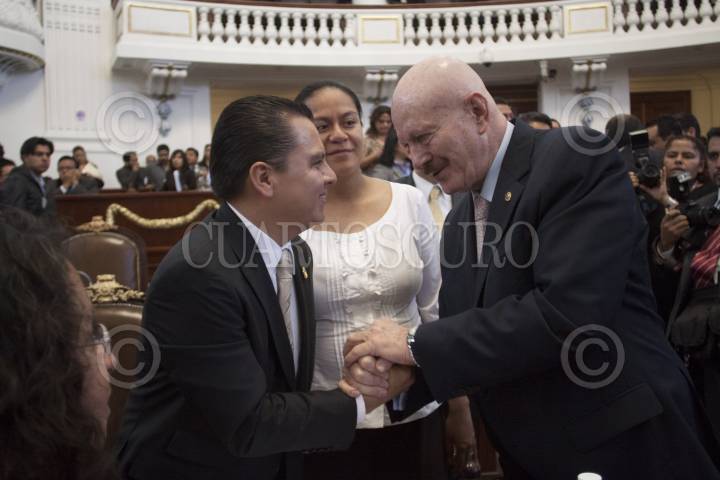 MÉXICO, D.F., 04OCTUBRE2012.- Manuel Granados, coordinador de los asambleistas del PRD, despide a Manuel Mondragón y Kalb, secretario de Seguridad Pública del DF, quien compareció ante el pleno de la Asamblea Legislativa del DF. FOTO: MOISÉS PABLO /CUARTOSCURO.COM