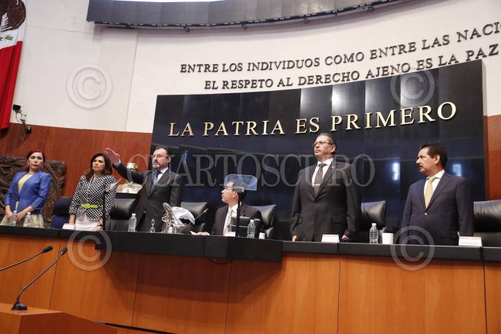 CIUDAD DE MÉXICO, 28FEBRERO2017.- Luis Videgaray, secretario de Relaciones Exteriores (SRE) toma protesta previo al inició de su comparecencia ante el pleno del Senado de la República, y en la cual abordó la relación México-Estados Unidos. FOTO: CUARTOSCURO.COM