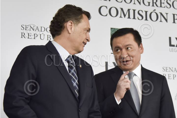 CIUDAD DE MÉXICO, 21MAYO2019.- Senadores de las bancadas del PRI, PAN, Movimiento Ciudadano y PRD, ofrecieron conferencia de prensa para fijar su postura en solicitar la comparecencia de Carlos Urzúa, secretario de Hacienda y Crédito Público, ante la reciente renuncia de Germán Martínez, director general del Instituto Mexicano del Seguro Social (IMSS). En la imagen, los coordinadores Mauricio Kuri (PAN), y Miguel Ángel Osorio Chong (PRI). FOTO: MARIO JASSO /CUARTOSCURO.COM