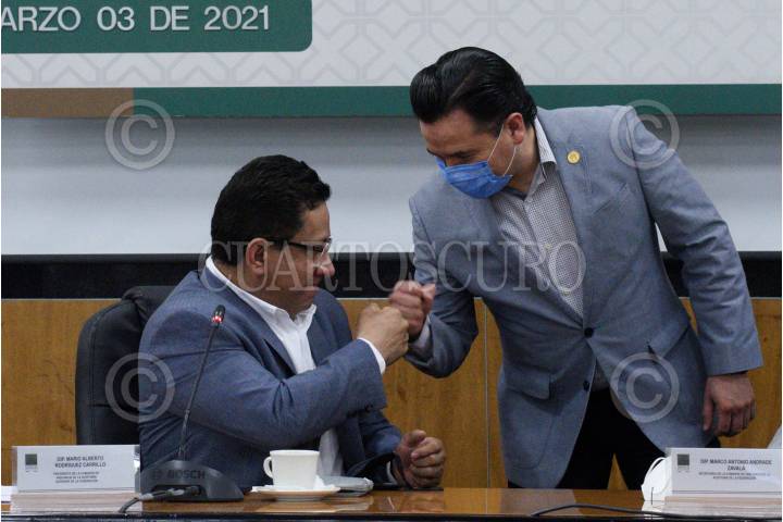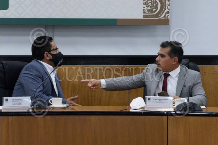 Los legisladores Mario Alberto Rodríguez y Marco Antonio Andrade, durante la reunión extraordinaria de la Comisión de Vigilancia de la Auditoría Superior de la Federación, en la que se aprobó la fecha de la comparecencia de Agustín Caso, auditor especial de Desempeño de la ASF.