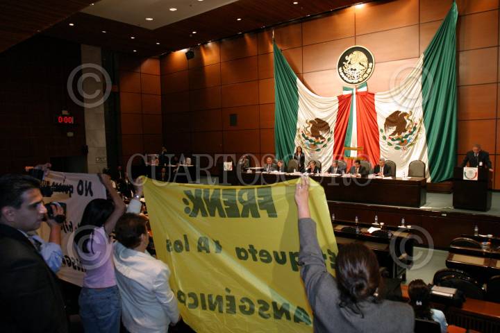 MEXICO D.F. 23SEPTIEMBRE2004.- Integrantes de Green peace se manifestron en contra de los productos transgénicos durante la comparecencia del secretario de salud, Julio Frenk, ante diputados, en el salón verde de san Lázaro. FOTO: Sandra Perdomo/CUARTOSCURO.COM