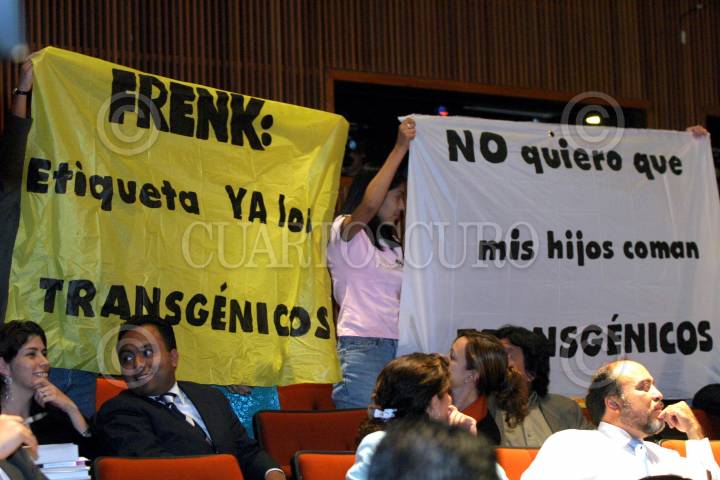 MEXICO D.F. 23SEPTIEMBRE2004.- Integrantes de la organización Green Peace se manifestron en contra de los productos transgénicos durante la comparecencia del secretario de salud, Julio Frenk, en el salón verde de san Lázaro. FOTO: Sandra Perdomo/CUARTOSCURO.COM