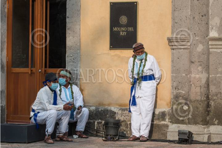Tres hombres de comunidades originarias esperan el inicio de la inauguración del museo “Cencalli, la casa del maíz y la cultura alimentaria” en las instalaciones de Molino del Rey del Complejo Cultural Los Pinos.