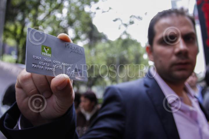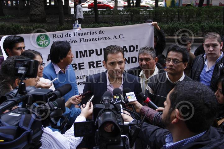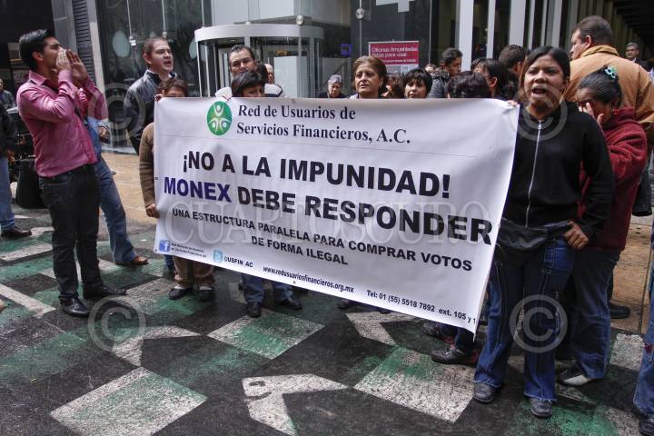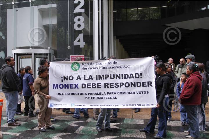 MÉXICO, D.F., 12JULIO2012.- Miembros de la Red de Usuarios de Servicios Financieros, encabezó una protesta frente al edificio donde se encuentran las oficinas de la empresa Monex, acusada de triangular fondos para beneficiar al PRI durante la elección presidencial. FOTO: ISAAC ESQUIVEL /CUARTOSCURO.COM