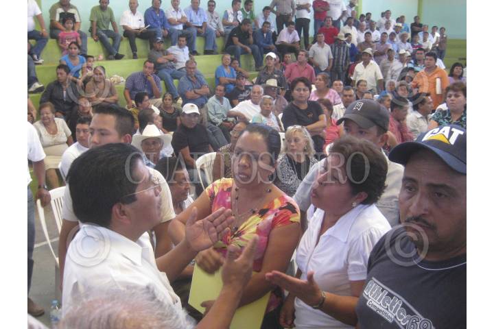 ZUMPANGO DEL RÍO, GUERRERO, 17ENERO2012.- Se realizó una asamblea por parte de los comuneros de Zumpango del Rio para renovar a la presidencia de los bienes comunales que encabezaba Emperatriz Basilio, en la reunión hubó conatos de enfrentamiento entre seguidores de esta y los comuneros que encabezaba el ex alcalde Adrian Alarcon Rios. En la imagen Emperatriz Basilio y seguidores discuten con el subdelegado jurídico de la Procuraduría Agraria Jesús González García. FOTO: OSCAR ALVARADO/CUARTOSCURO.COM