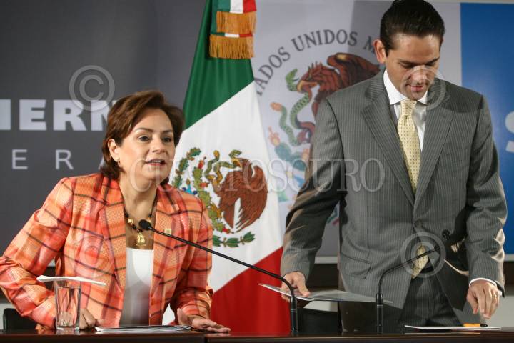 MÉXICO D.F., 27JUNIO2008.- Juan Camilo Mouriño acompañado por Patricia Espinoza secretaria de relaciones exteriores durante la conferencia de prensa que ofrecieron esta mañana a los medios de comunicación. FOTO: SÁSHENKA GUTIÉRREZ/CUARTOSCURO.COM