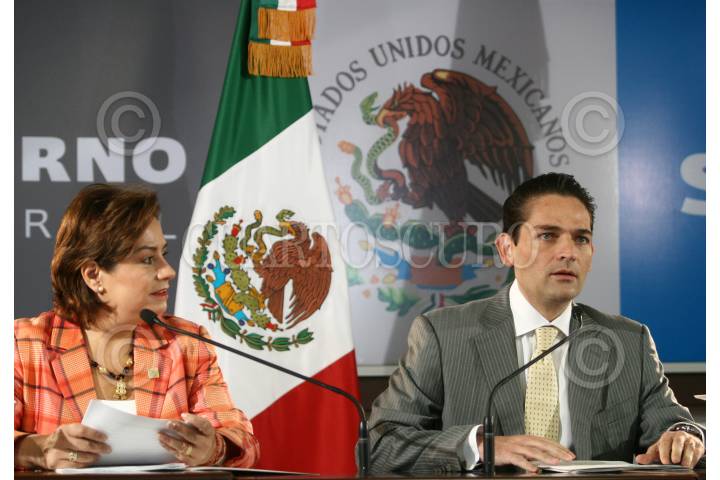 MÉXICO D.F., 27JUNIO2008.- Juan Camilo Mouriñoacompañado por Patricia Espinoza secretaria de relaciones exteriores durante la conferencia de prensa que ofrecieron esta mañana a los medios de comunicación. FOTO: SÁSHENKA GUTIÉRREZ/CUARTOSCURO.COM