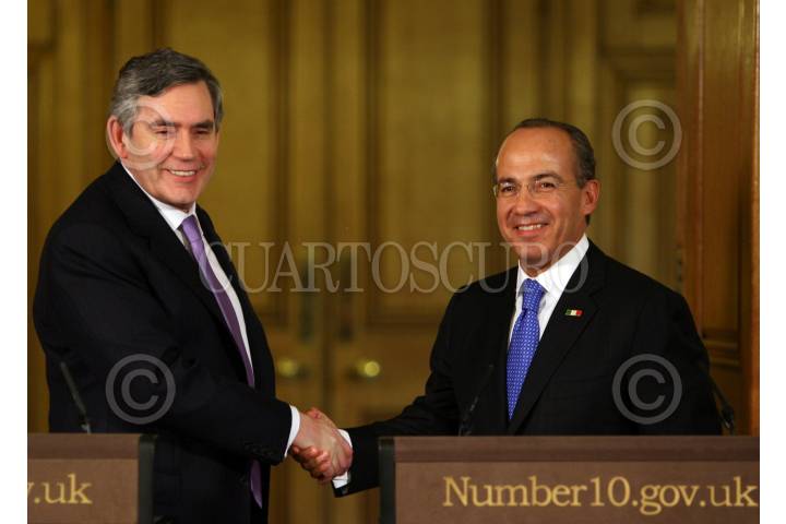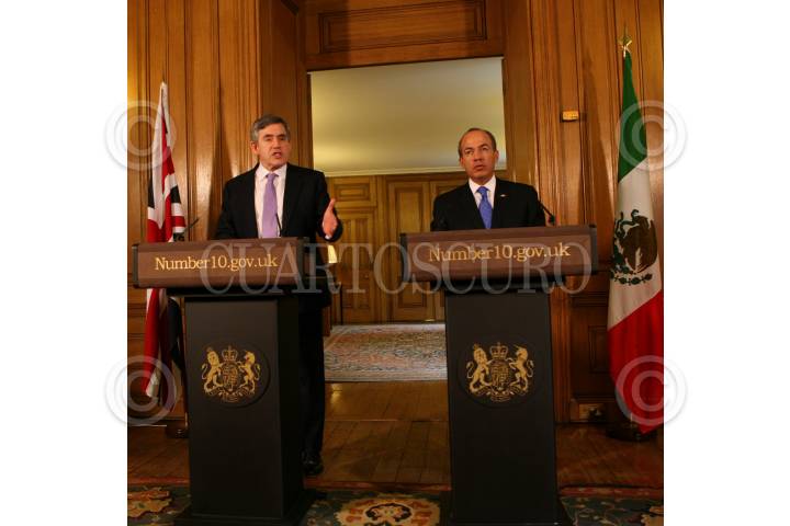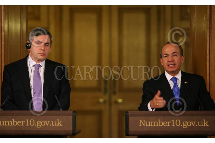 LONDRES, INGLATERRA, 30MARZO2009.- El presidente de México, Felipe Calderón Hinojosa y el primer ministro del Reino Unido, Gordon Brown, durante la conferencia de prensa que ofrecieron esta tarde a los medios de comunicación. Ésto sucedió en el salon de Columnas de las oficinas del primer ministro. FOTO: ARIEL GUTIERREZ/CUARTOSCURO.COM