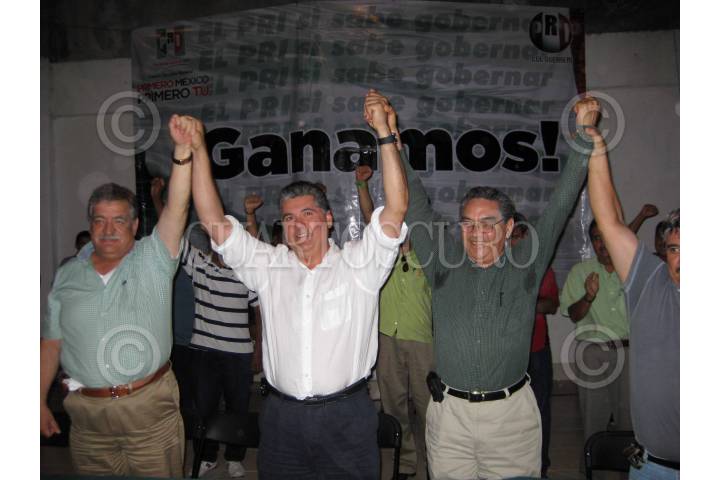 CHILPANCINGO, GUERRERO 06JULIO2009.- Con las manos en alto los Integrantes de la dirigencia estatal del PRI encabezados por el dirigente estatal Marco Antonio Leyva Mena celebraron el triunfo contundente de sus candidatos a diputados federales al termino de la conferencia de prensa que ofrecieron la noche del domingo, a los representantes de los diversos medios de comunicacion. FOTO: OSCAR ALVARADO/CUARTOSCURO.COM
