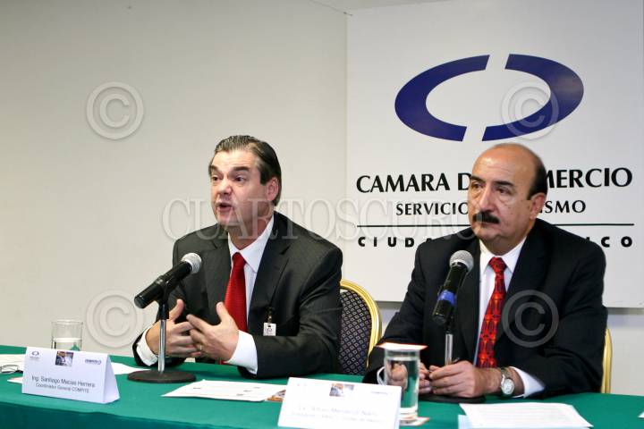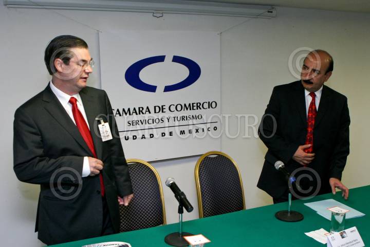 MÉXICO, D.F., 01OCTUBRE2009.- Santiago Macias Herrera, coordinador General COMPITE y Arturo Mendicuti Narro, titular de la Cámara de Comercio, Servicios y Turismo de la Ciudad de México (CANACO) durante una conferencia de prensa que ofrecieron a los medios de comunicación. FOTO: RODOLFO ANGULO/CUARTOSCURO.COM