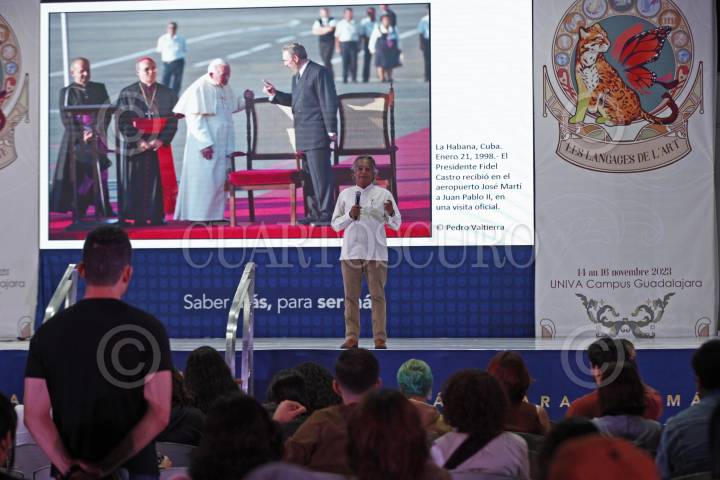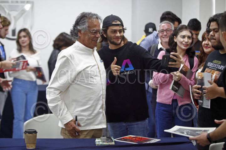 ZAPOPAN, JALISCO, 15NOVIEMBRE2023.- El Fotoperiodista y Director general de la Agencia y Revista Cuartoscuro, Pedro Valtierra, participo en el Congreso Internacional de Comunicación, Lenguajes y Multimedia (CIDCAP 2023), que organiza la Universidad UNIVA y fue uno de los ponentes destacados de Los Lenguajes del Arte, donde hablo sobre fotoperiodismo con los alumnos de ya mencionada alma mater. Posteriormente platico en privado con algunos alumnos, firmo revistas Cuartoscuro y se tomo fotografías. FOTO: FERNANDO CARRANZA GARCIA / CUARTOSCURO.COM
