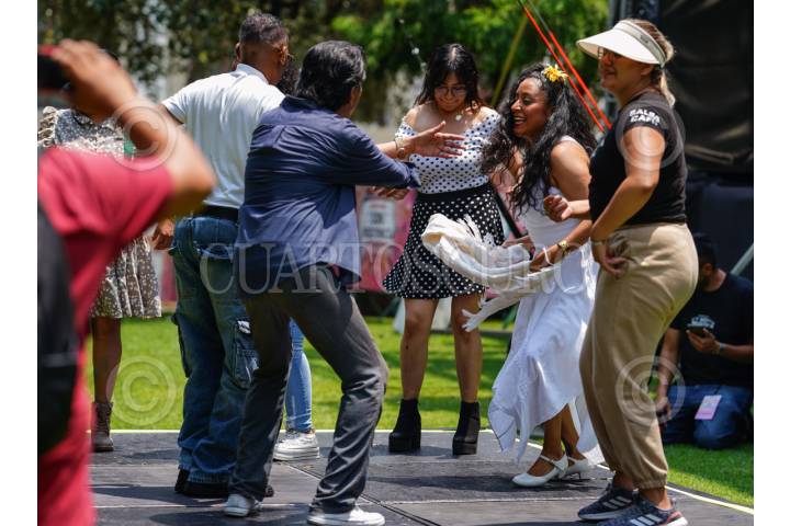 CIUDAD DE MÉXICO, 06SEPTIEMBRE2025.- Asistentes bailan con una de las integrantes del grupo Rumba Morena durante su presentación en el festival “Son Resistencia” en el Complejo Cultural Los Pinos. El acto busca reconoce el legado cultural de los pueblos y comunidades indígenas y afromexicanas que forman parte nuestra identidad y memoria. FOTO: GALO CAÑAS/CUARTOSCURO.COM