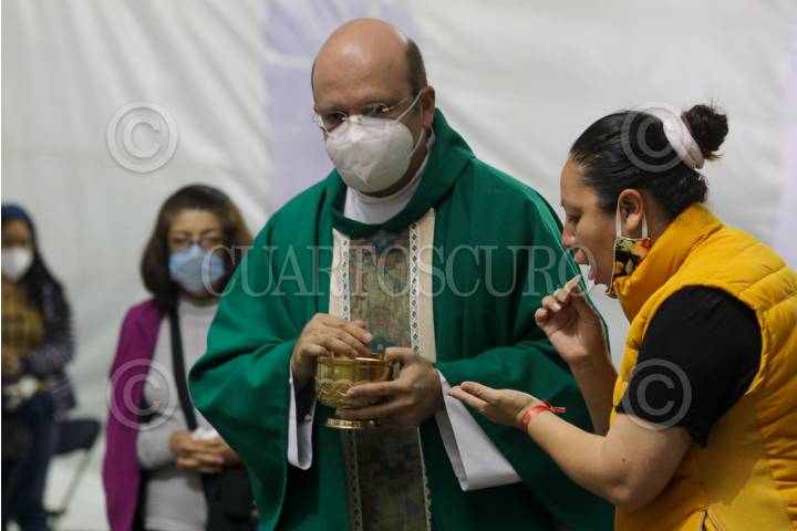 Una mujer recibió la comunión en sus manos para evitar contagios de Covid-19 durante la Eucaristía Dominical en la Cátedral San Bernardino, alcaldía Xochimilco
