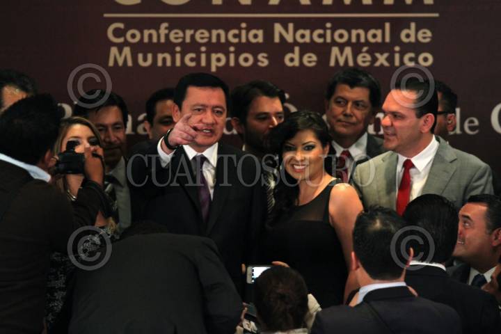 MÉXICO, D.F., 19MAYO2015.- Miguel Ángel Osorio Chong, secretario de gobernación, Mariano Gonzalez Zarur, gobernador de Tlaxcala y presidente de la Conago y Renán Barrera Concha, Alcalde de Mérida y presidente de la Conamm, presidieron la Conferencia Nacional de Municipios de México realizada en un Hotel de la Ciudad de México. En la imagen, Leticia Quezada, delegada de la Magdalena Contreras (PRD), pide su fotografía con el Secretario de Gobernación. FOTO: ADOLFO VLADIMIR /CUARTOSCURO.COM
